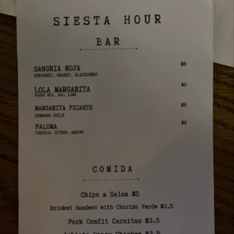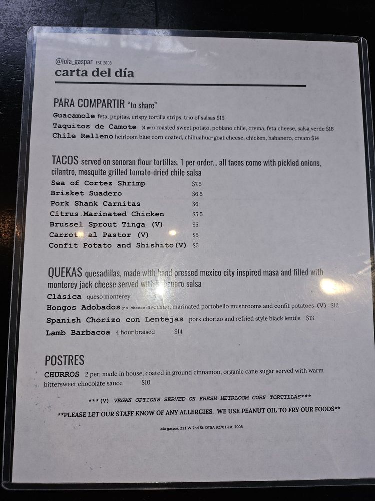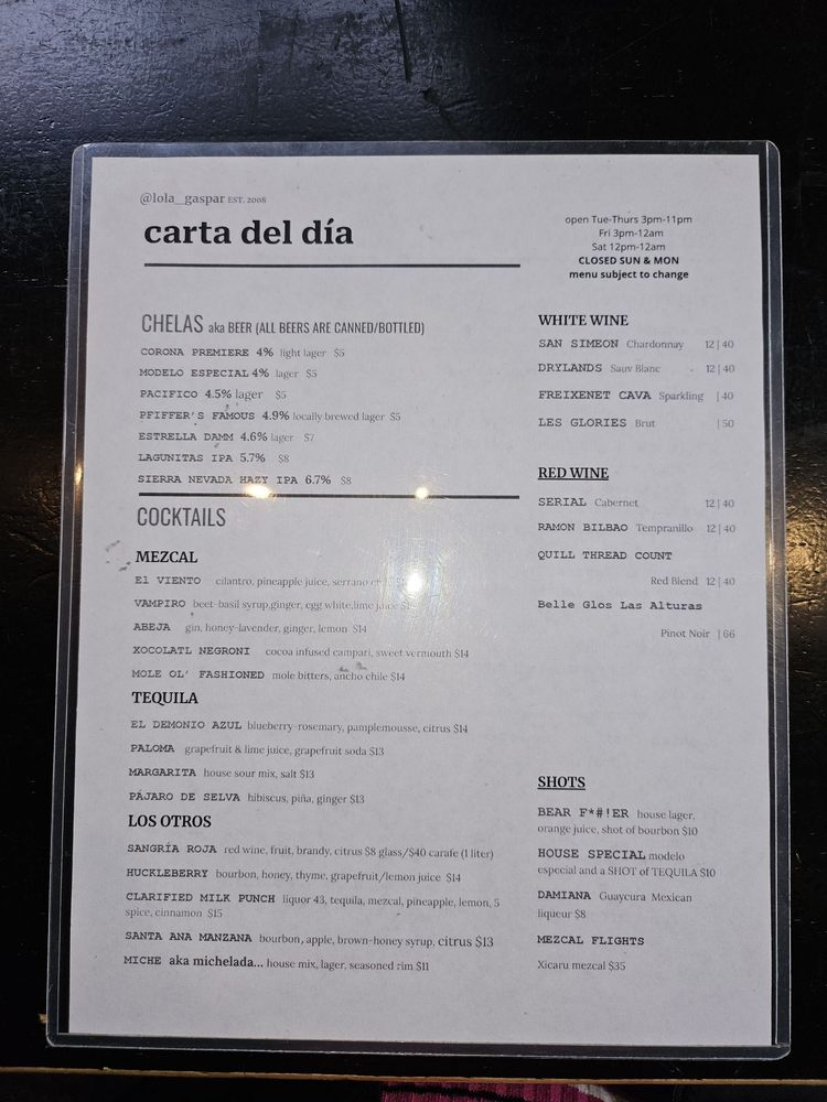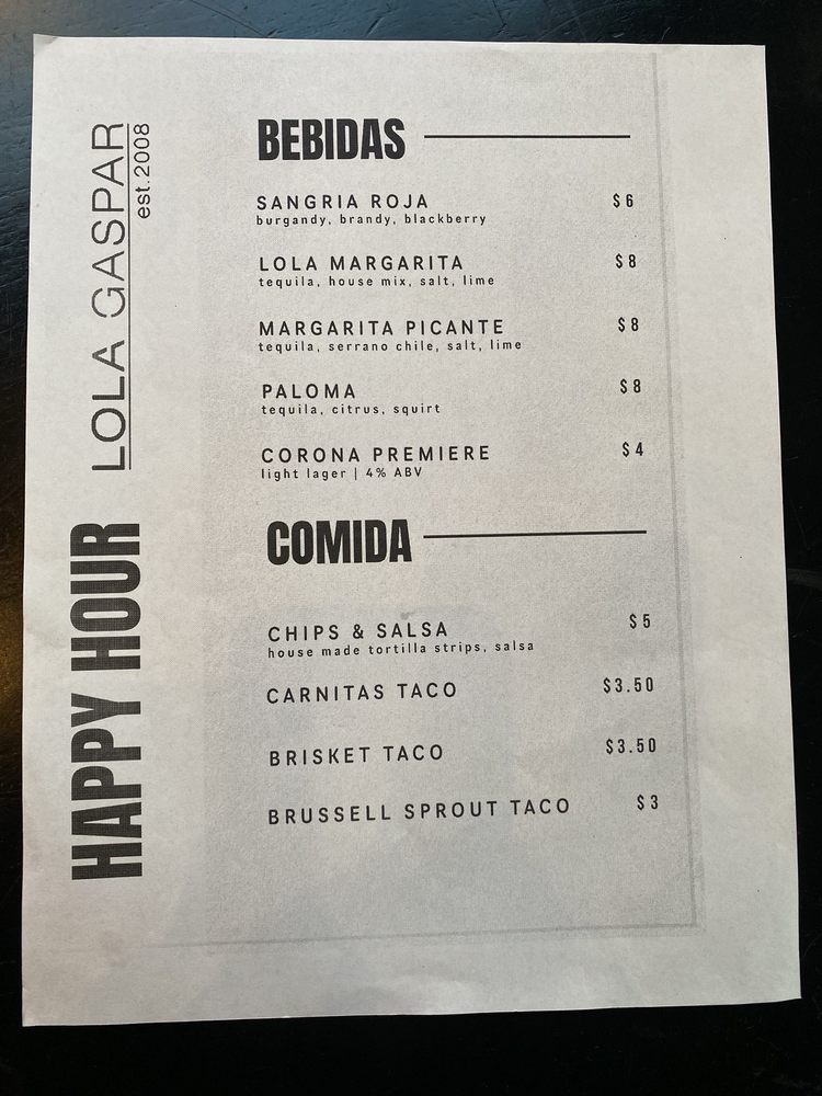 Located in Santa Ana, CA, Lola Gaspar is a Latin American-Mexican bar known for its cozy ambiance and signature dishes. Offering a variety of options for both food and drinks, customers rave about the guacamole, chile relleno, and tacos, with a special mention of the bacon-wrapped dates and elote appetizers. The bartenders are praised for their generous pours and refreshing cocktail creations. With a lounge-like feel and a welcoming patio, Lola Gaspar is a hidden gem in the bustling Artist Village of DTSA. Don't miss out on their happy hour specials and Taco Tuesday menu for an unforgettable dining experience. Whether you're looking for a casual hangout or a romantic date spot, Lola Gaspar has something for everyone.